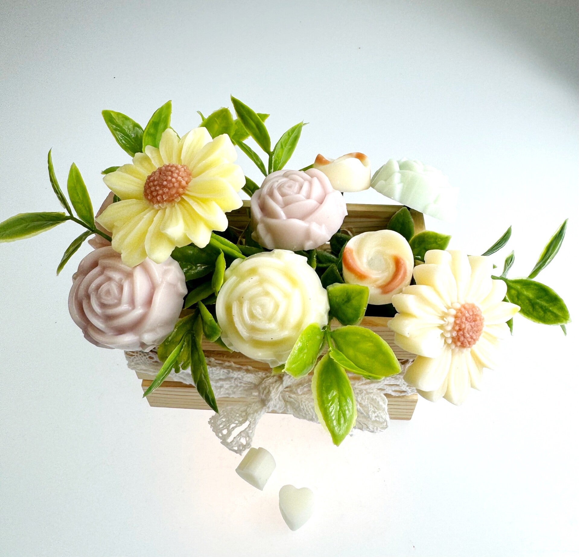 Deze handgemaakte waxmelts zijn gegoten in bloemvorm en gerangschikt in een houten kratje – een geurboeket zó mooi dat je het bijna niet durft te smelten.