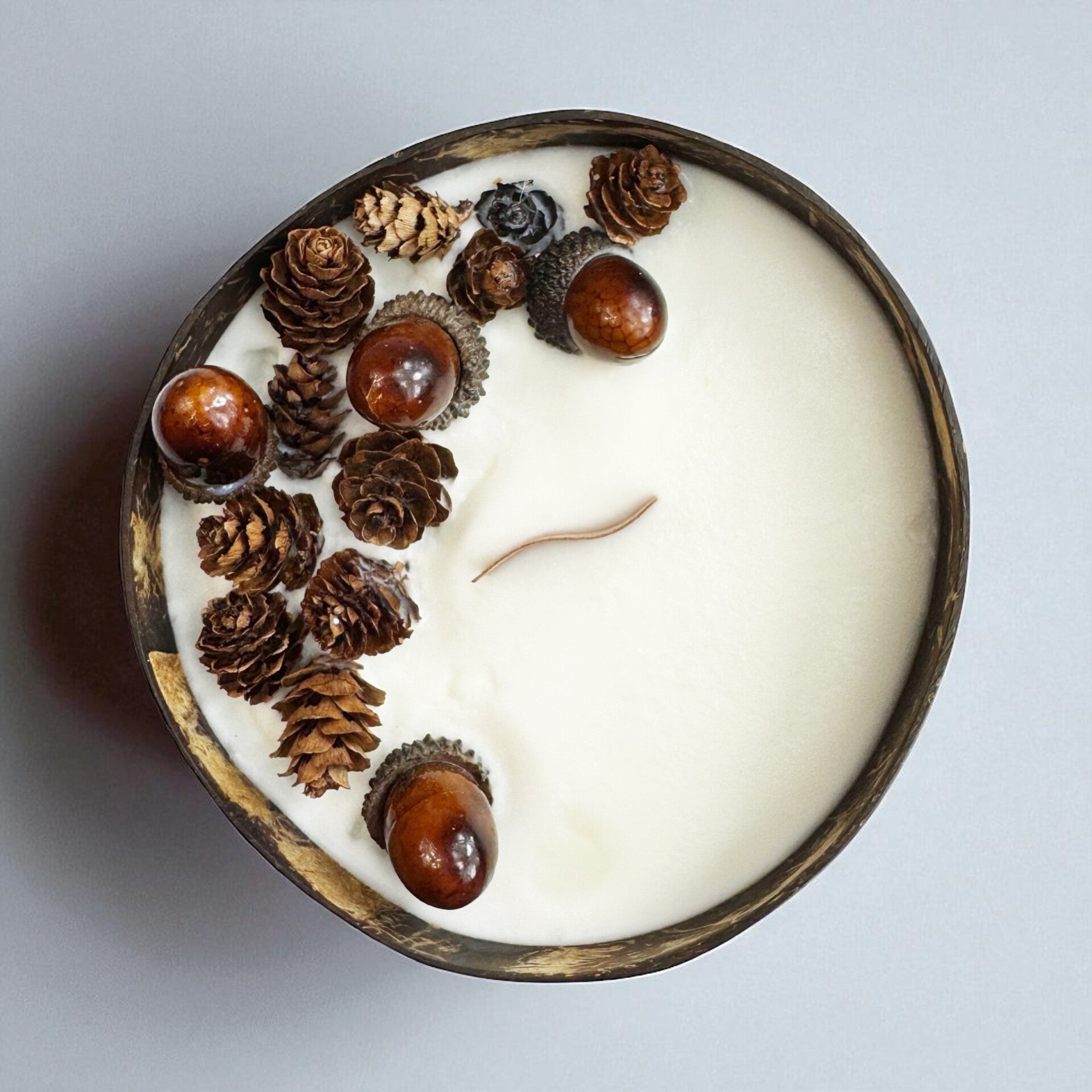 De geur Herfst Gloed is een uitnodigende mix van kruidige accenten, warme houtnoten en een vleugje zoete amber. Het voelt alsof je een knapperend haardvuur en vallende bladeren in huis haalt. Afgewerkt met echte blaadjes en eikeltjes, waardoor elke kaars een unieke herfstige eyecatcher is.