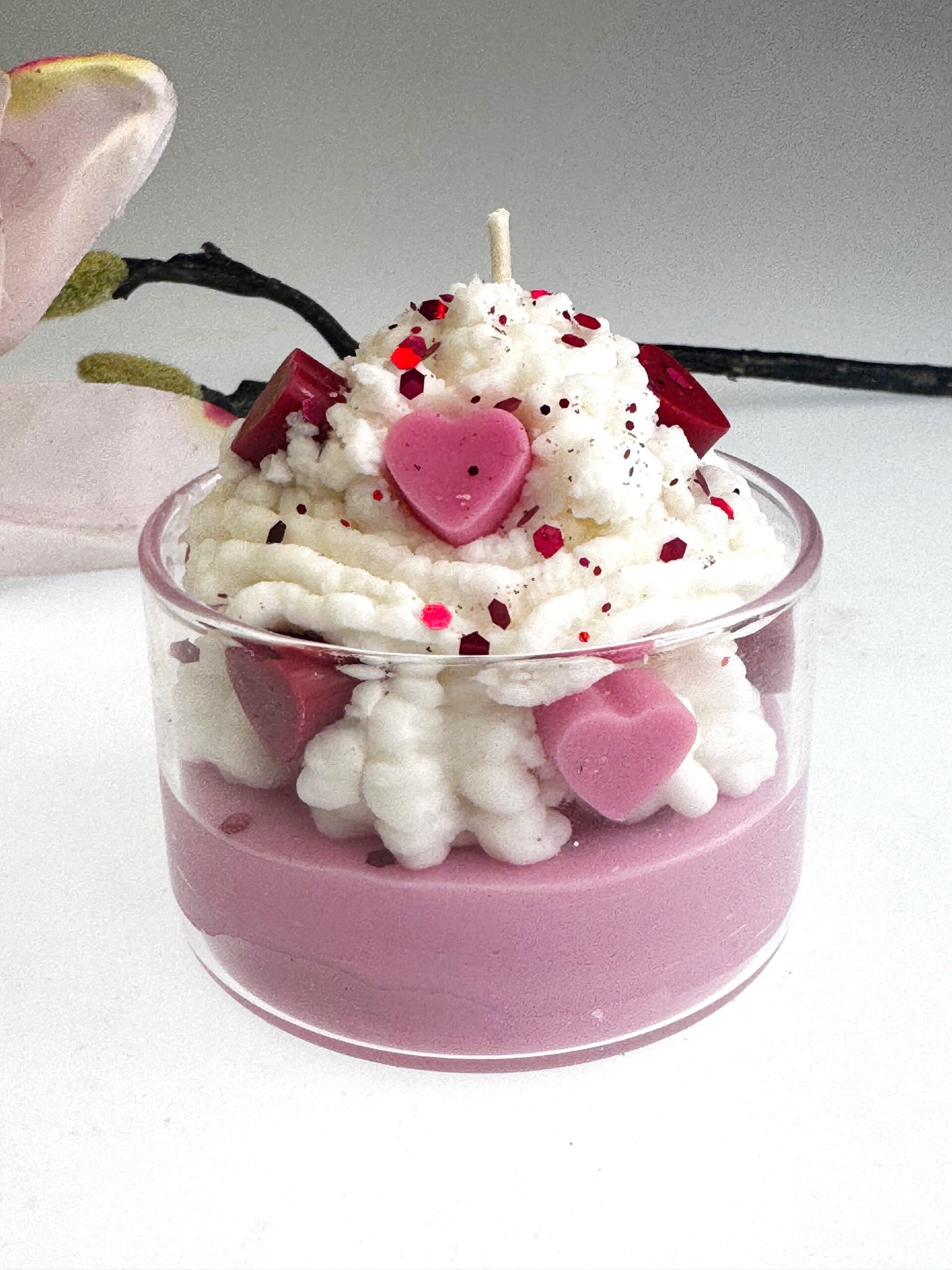 De luxe dessert-uitstraling met romige topping en hartdetails maakt deze kaars niet alleen heerlijk om te branden, maar ook prachtig om neer te zetten of cadeau te geven.
