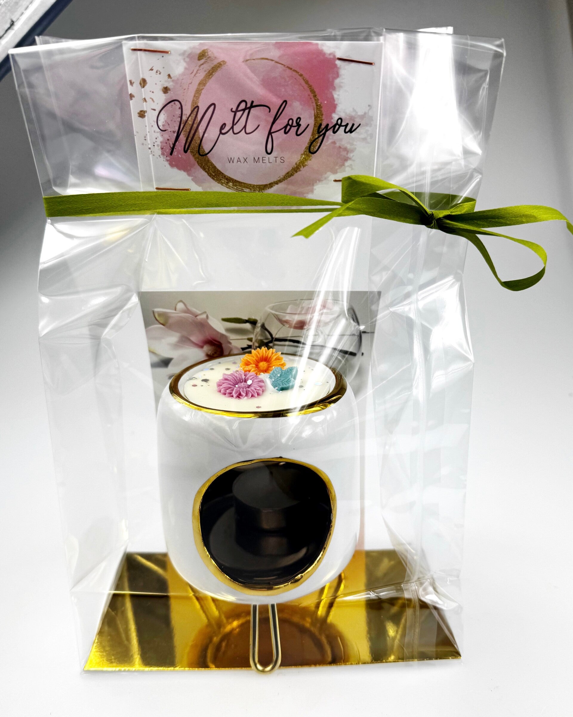 Een luxe witte brander met gouden details, al gevuld met onze geur Yozaka en afgewerkt met drie decoratieve bloemen van sojawax.